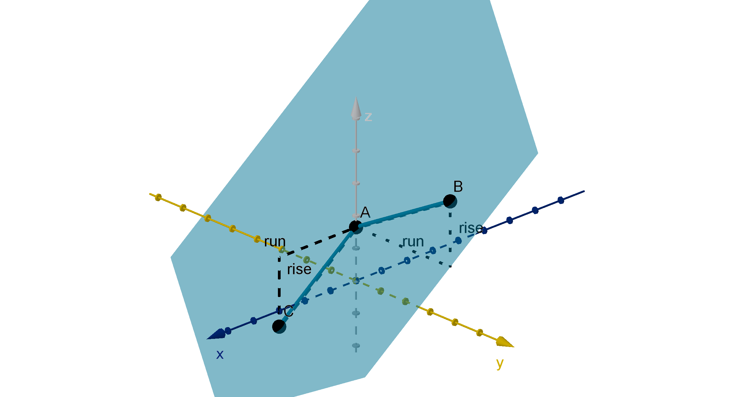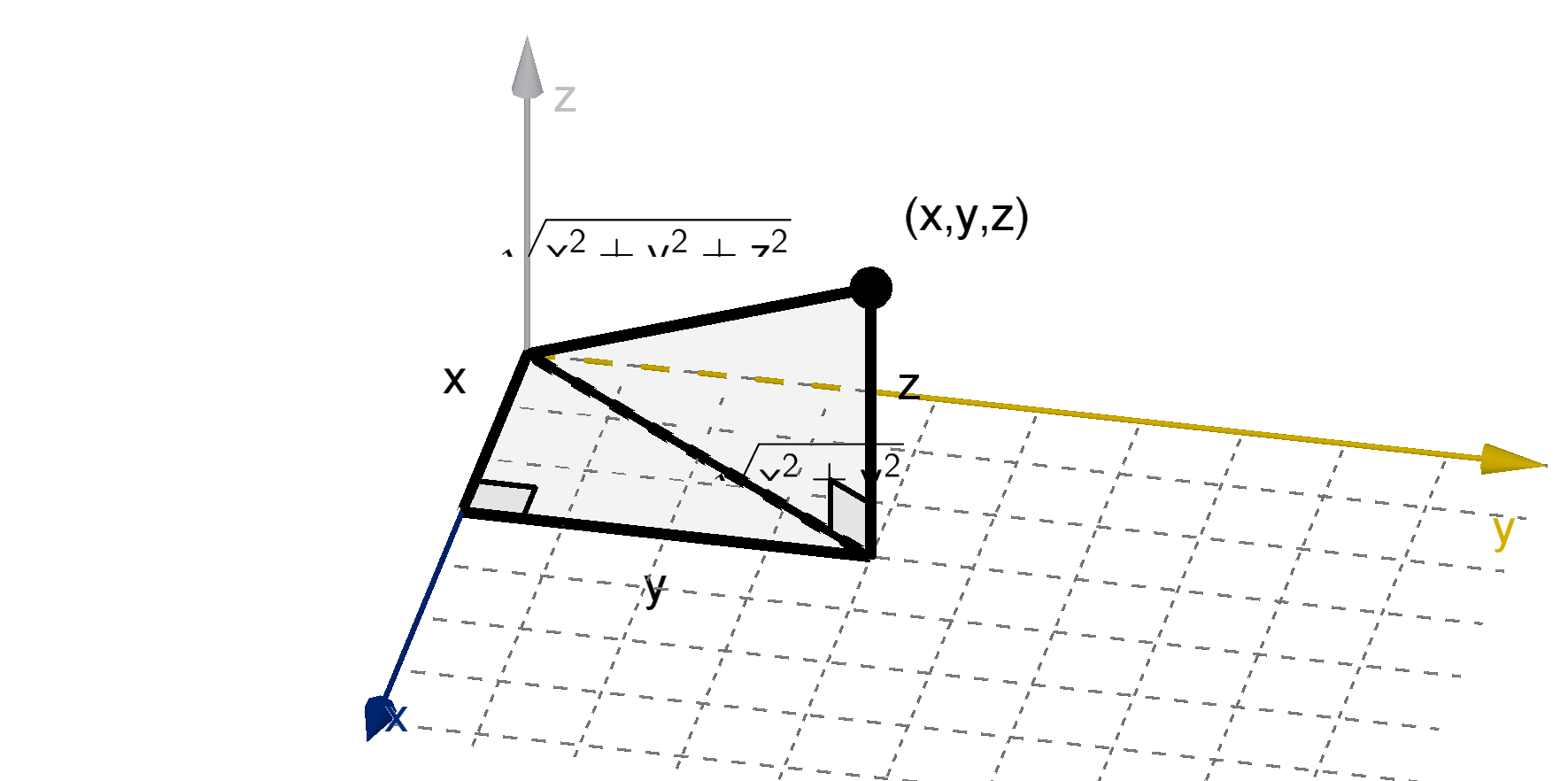 The right triangle with the vertices (0, 0, 0), (x, y, 0) and (x, y, z) allows us to apply the Pythagorean